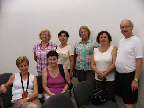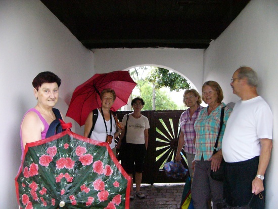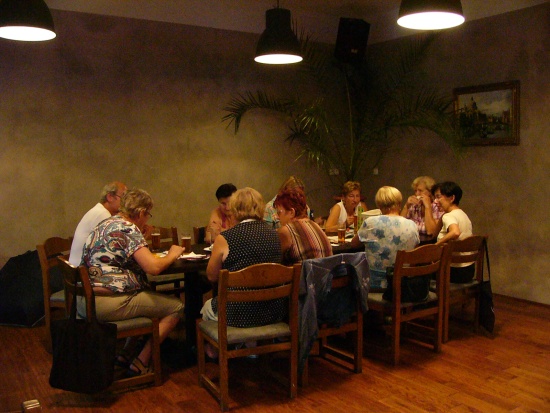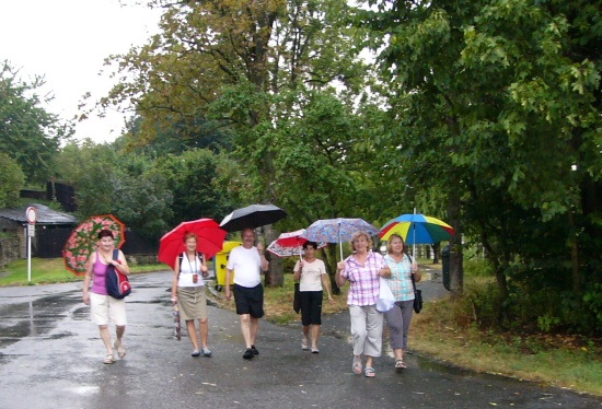 Po dlouhotrvajícím suchu a dlouhé šňůře tropických dní konečně přišel ve středu 12.8. toužebně očekávaný déšť. A přišel s blížící se bouřkou právě před šestnáctou hodinou, když jsme měli sraz na třetí prázdninovou vycházku. Protože temné mraky a bouřka vypadaly hrozivě, bylo na místě srazu na Zámostí operativně rozhodnuto zkrátit původně plánovanou trasu s tím, že půjdeme na prohlídku kostelíčka sv. Kateřiny. Bouři a největší liják jsme tedy přečkali v rotundě, kde jsme si vyslechli fundovaný výklad mladé pracovnice muzea o této nejstarší románské stavbě východních Čech, včetně pověsti o sv. Kateřině. Teprve pak jsme se vypravili do nové restaurace v Bezděkově – nazvané Vavřínovy lázně, kam dorazili i ostatní, kteří šli do hospody přímo. Vavřínovy lázně slouží jako restaurace teprve krátce, byla vybudována v místě, kde byly ve dvacátých letech minulého století parní a vanové lázně pana Vavřína. My toto místo pamatujeme jako výrobnu těstovin (Dejsi), proto také někteří lidé tomuto novému restauračnímu zařízení říkají „U nudle“. Provozovatelem nynější restaurace je pan Chocholouš, který je pravnukem někdejšího „pana lázeňského“, Čeňka Vavřína. Restaurace si již našla řadu stálých návštěvníků, je nekuřácká, vkusně zařízena, má dobrou kuchyni – právě probíhal mexický týden. S jídlem jsme byli spokojeni, jen trochu vázla obsluha, ale posezení zde bylo velmi příjemné a výhled k řece romantický. Ještě nutno dodat, že jsme "zapili" Ondráška - vnoučka Dany a Jirky K.. MČ